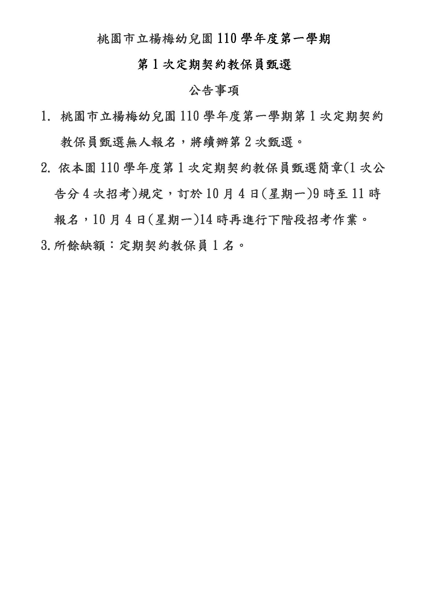 楊梅幼兒園110學年度第一學期第1次代理教保員無人應聘公告【缺額1名】