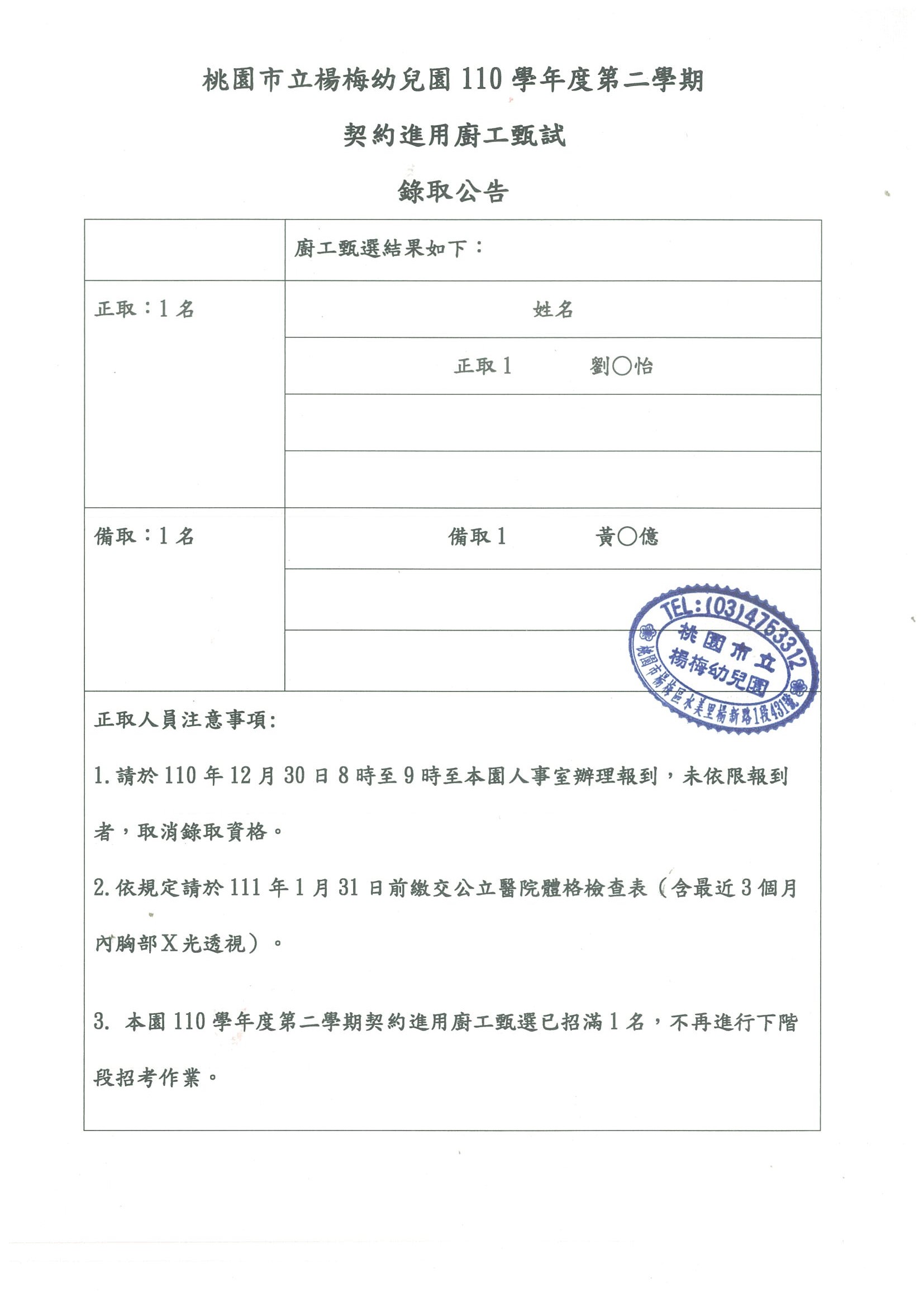 桃園市立楊梅幼兒園110學年度第二學期契約進用廚工錄取公告