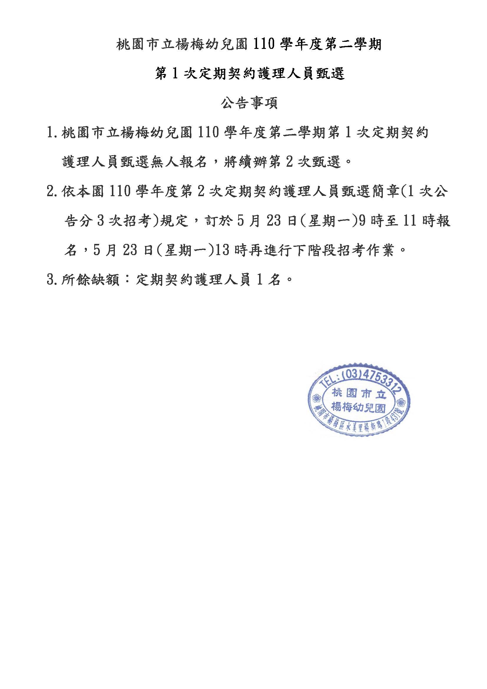 桃園市立楊梅幼兒園110學年度第二學期定期契約進用護理人員無人報名公告