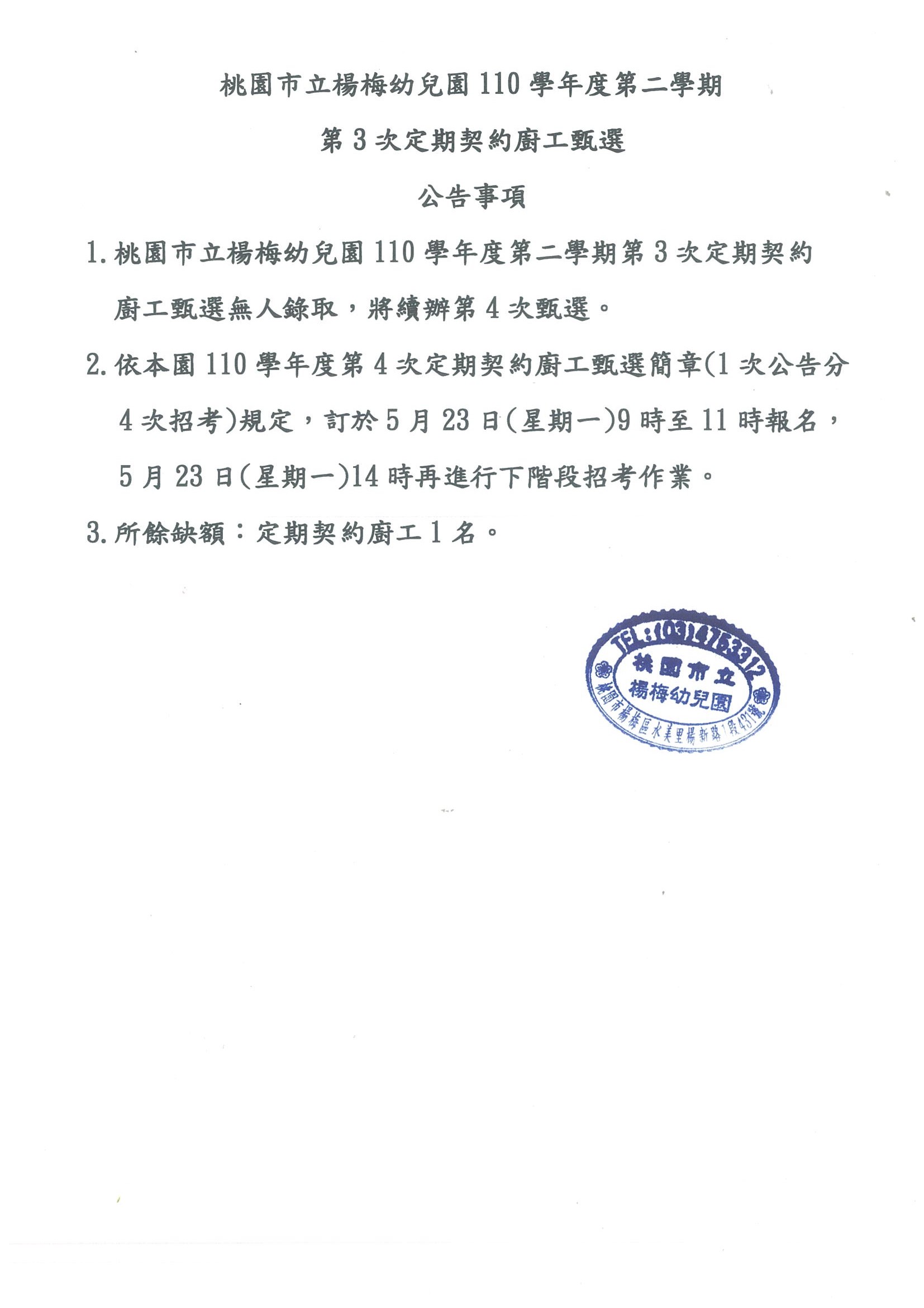 桃園市立楊梅幼兒園110學年度第二學期定期契約進用廚工無人錄取公告