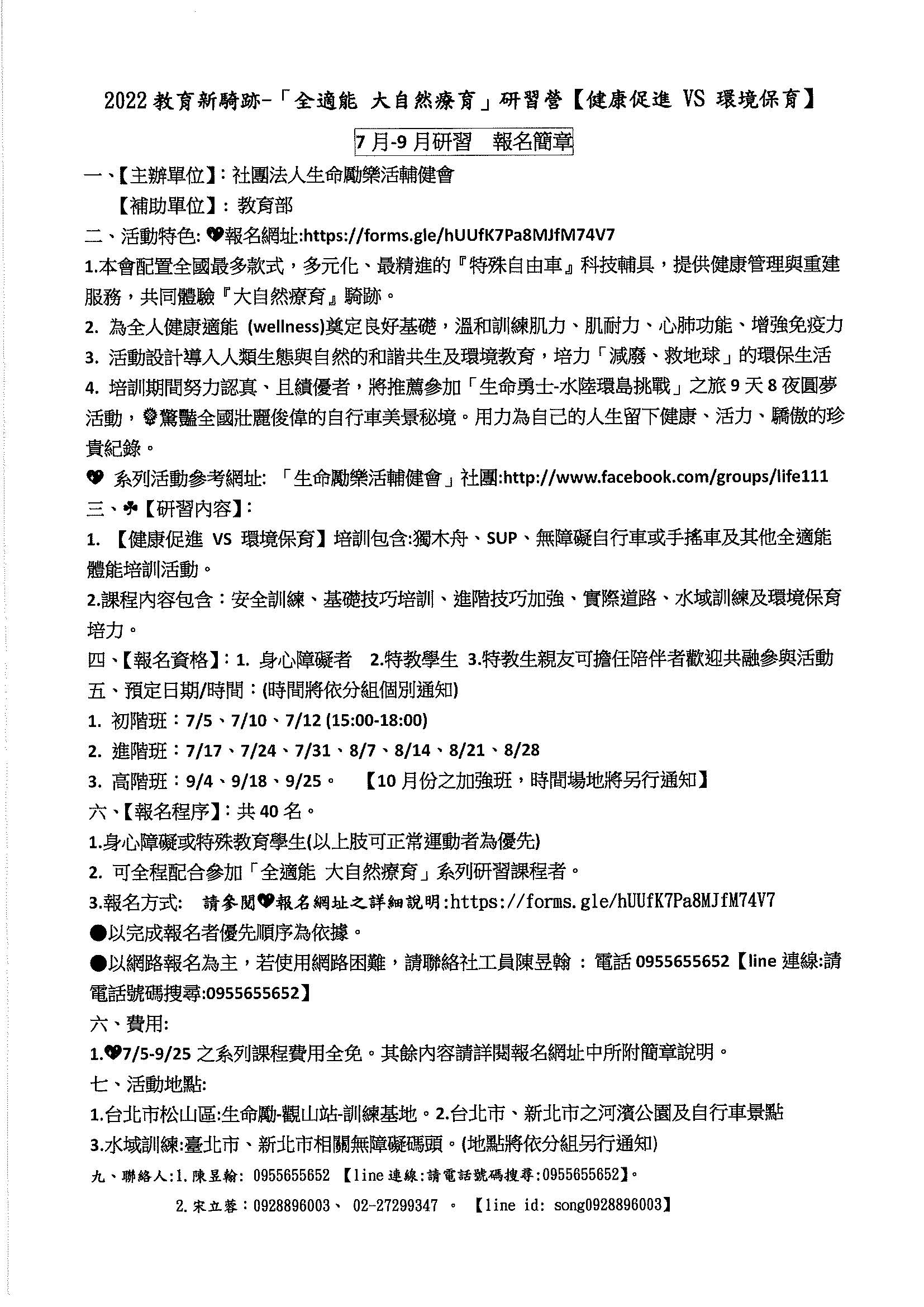 轉知:社團法人生命勵樂活輔健會辦理之2022教育新騎跡─「全適能 大自然療育」研習營【健康促進 VS 環境保育】活動簡章