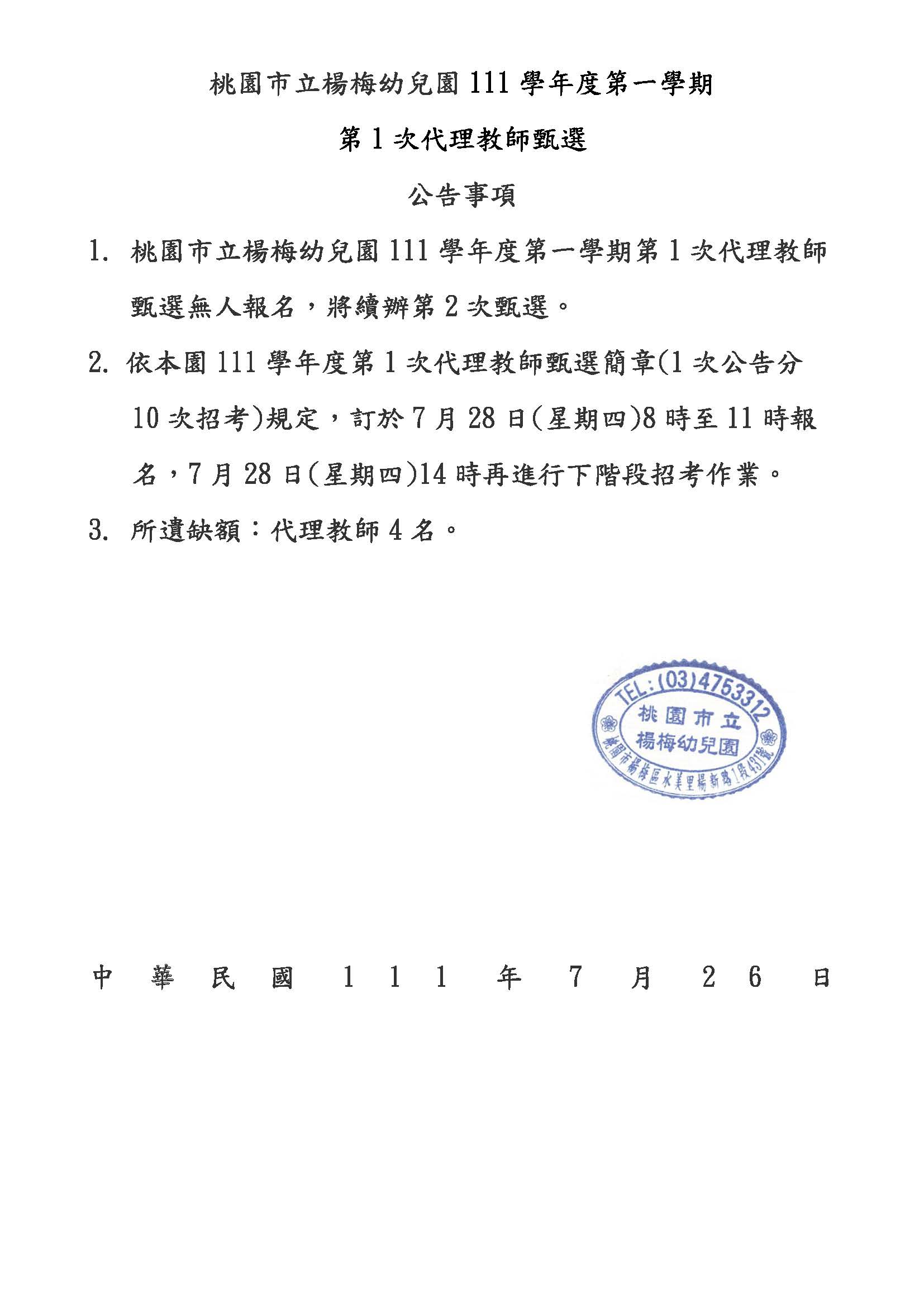 桃園市立楊梅幼兒園111學年度第一學期代理教師無人報名公告續辦第2招