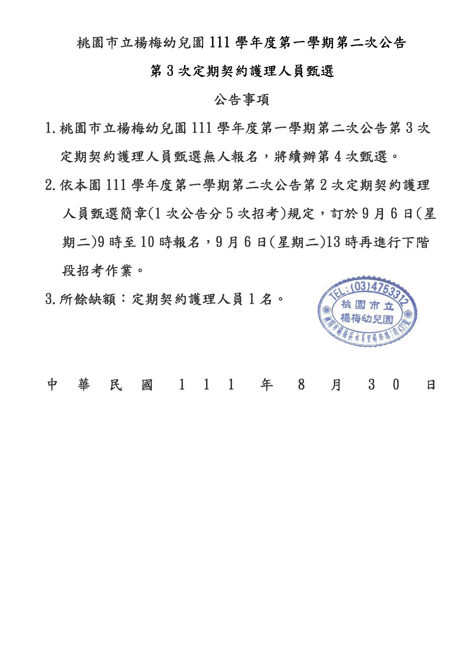 桃園市立楊梅幼兒園111學年度第一學期第二次公告第3次定期契約護理人員甄選無人報名公告
