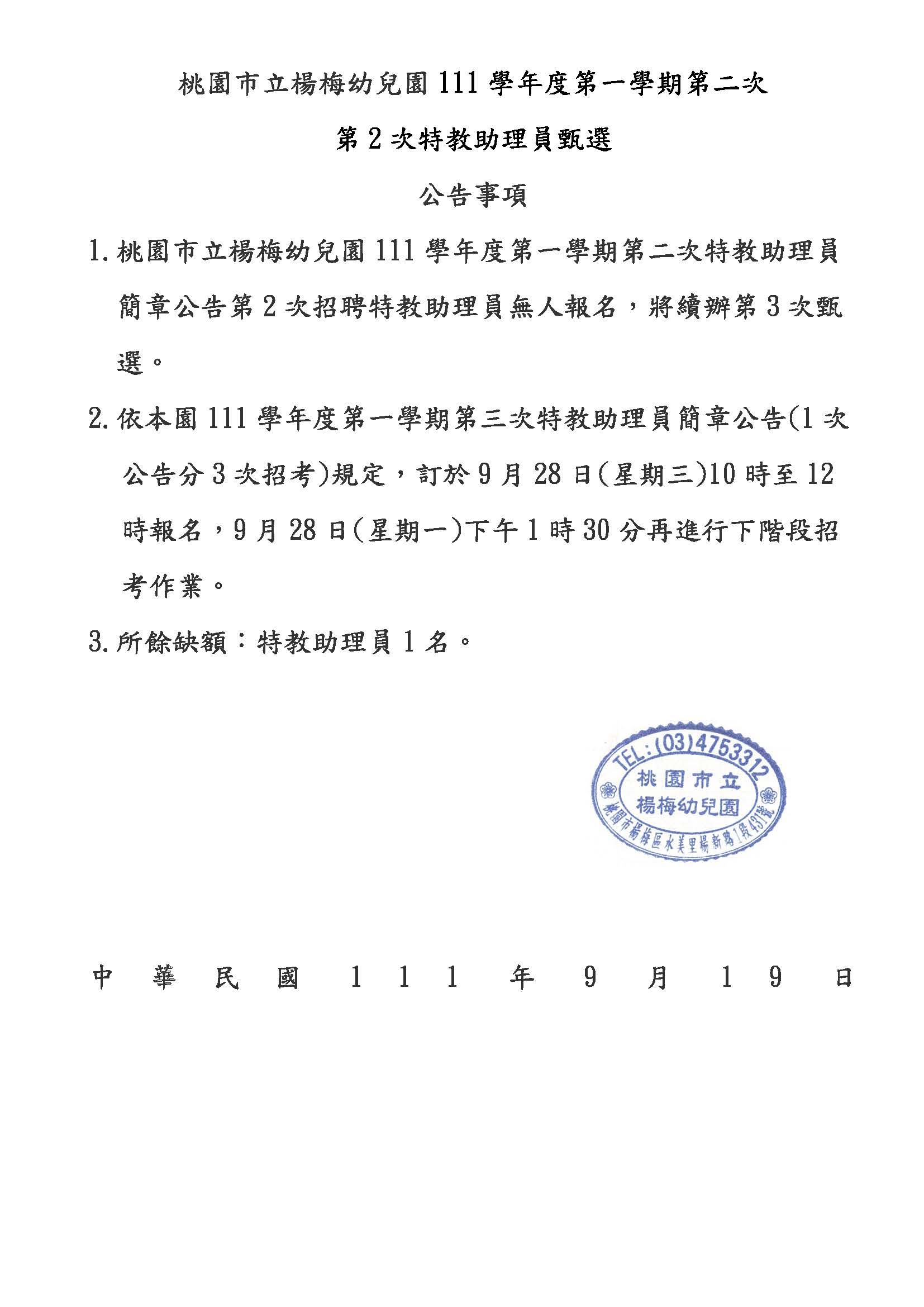 桃園市立楊梅幼兒園111學年度特教助理員無人報名公告