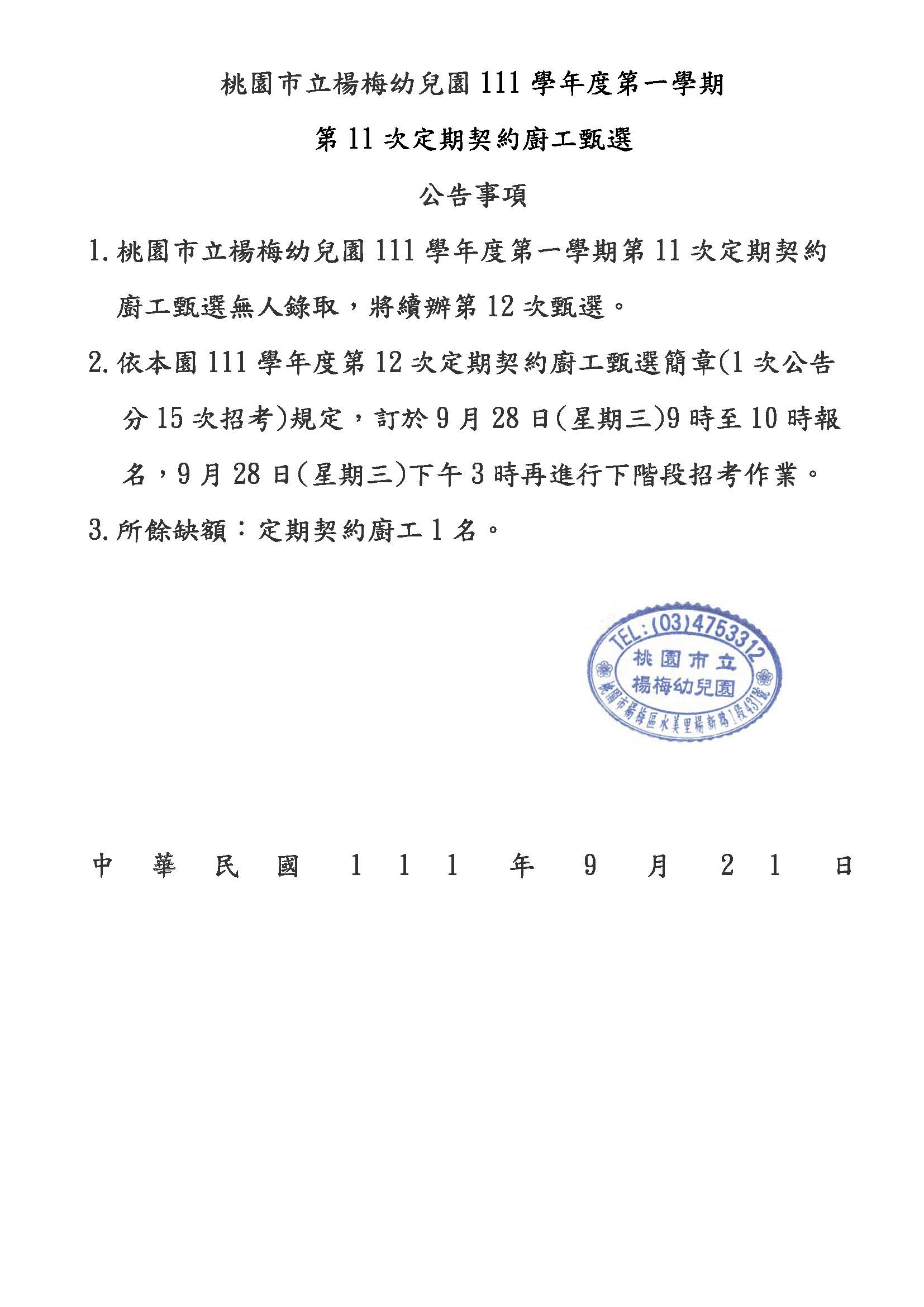 桃園市立楊梅幼兒園111學年度第一學期定期契約進用廚工無人報名公告