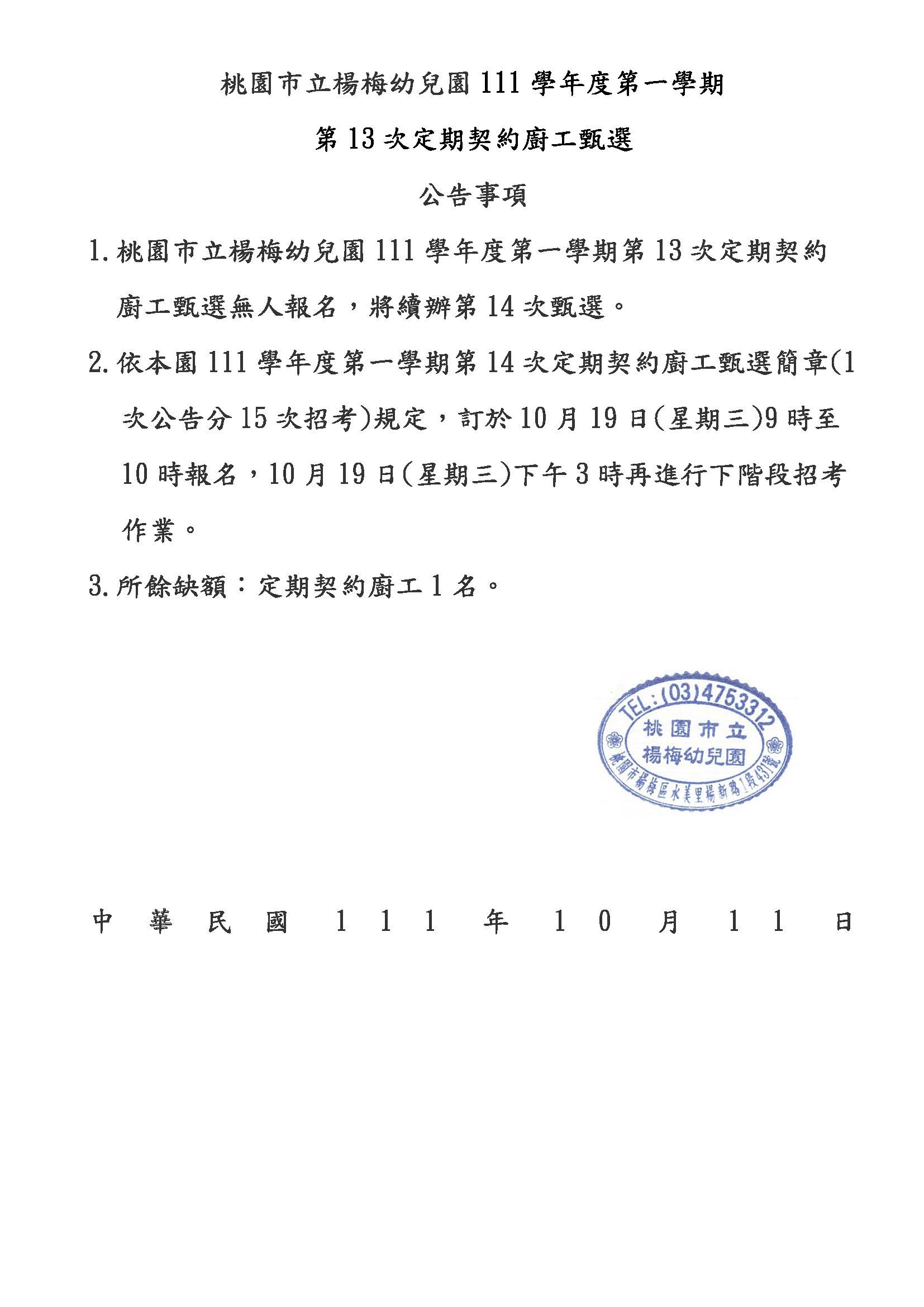 桃園市立楊梅幼兒園111學年度廚工無人報名公告