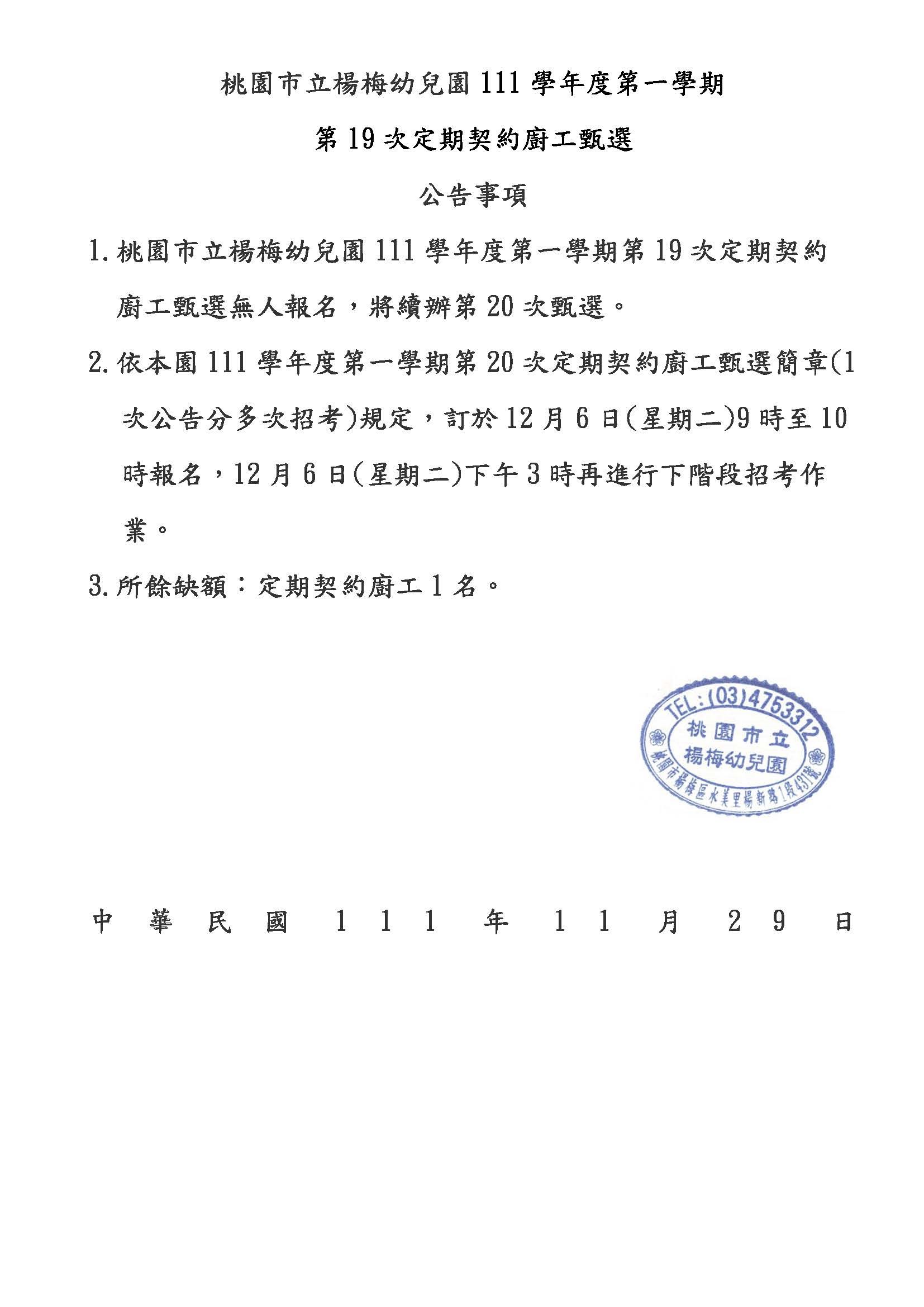 桃園市立楊梅幼兒園111學年度定期契約進用廚工第19次無人報名公告,續辦第20次公告