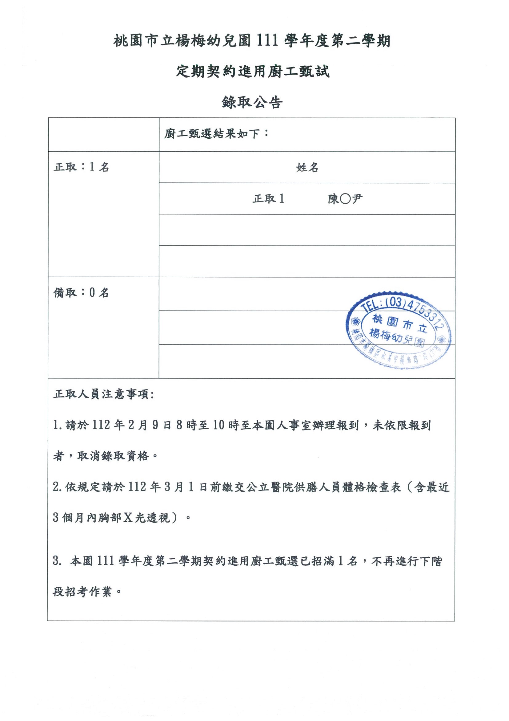 桃園市立楊梅幼兒園111學年度第二學期定期契約進用廚工錄取公告,已招滿,不再進行下階段招考作業。