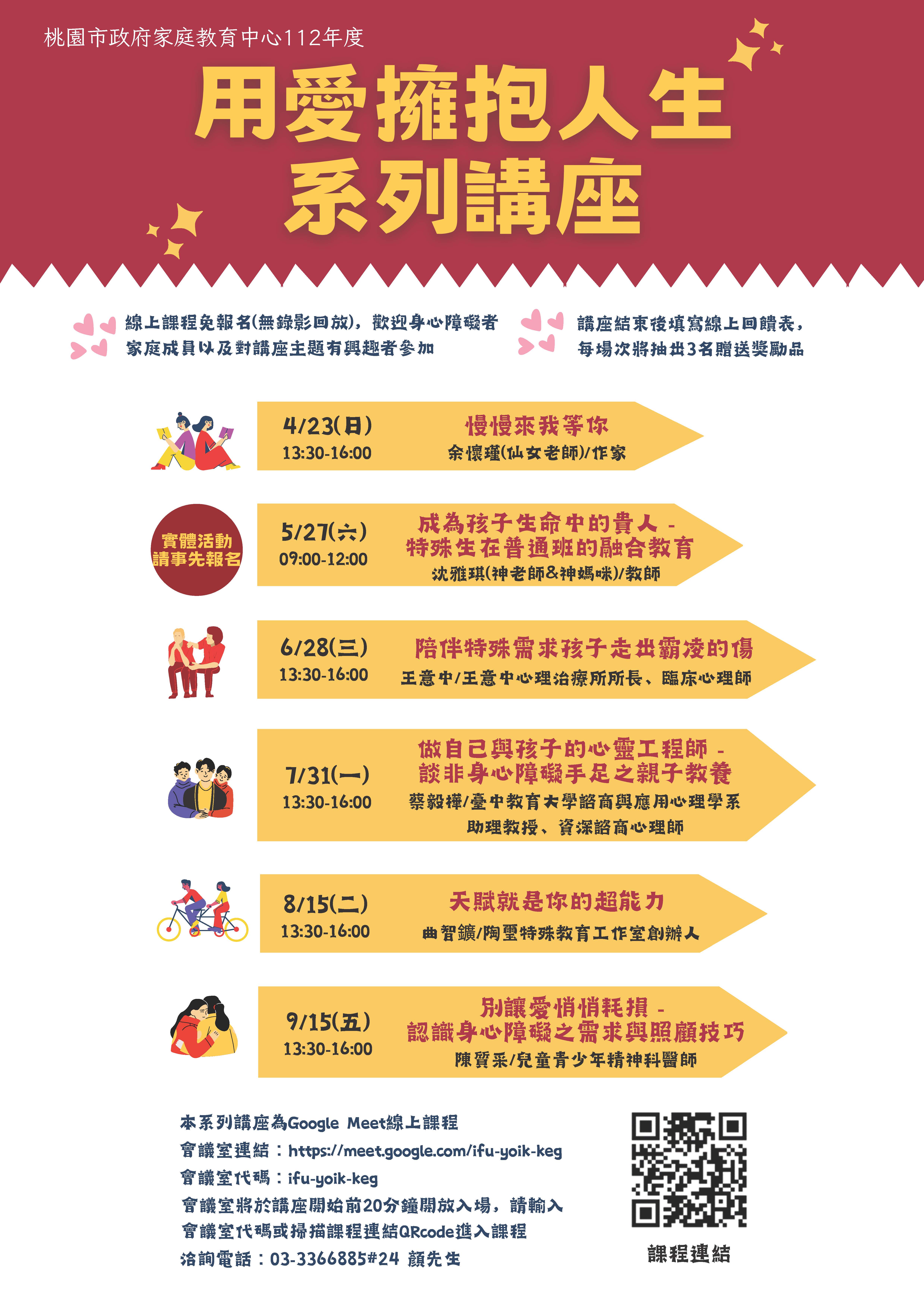 轉知:桃園市政府家庭教育中心112年「用愛擁抱人生系列講座」