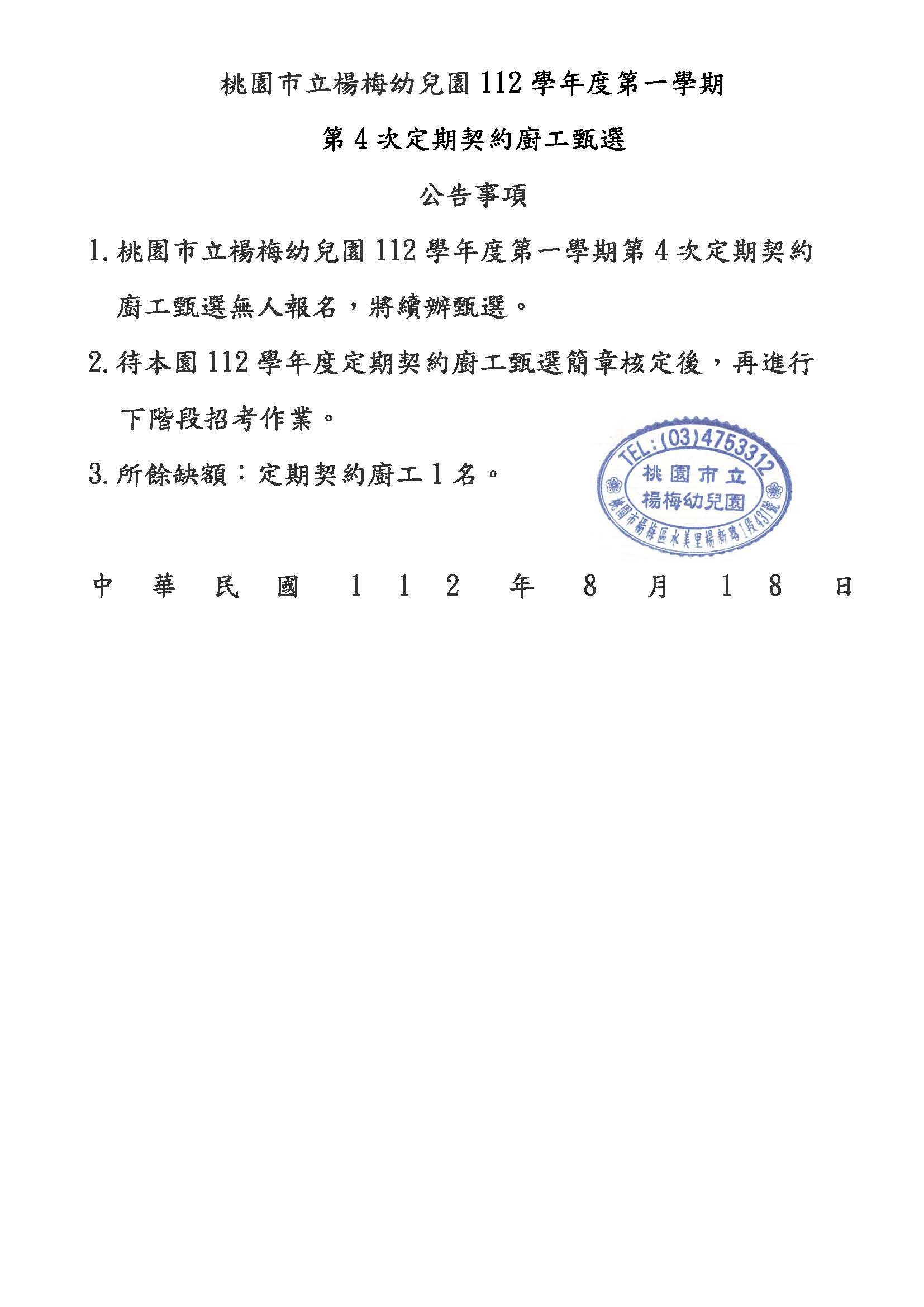 112學年度第一學期第4次定期契約進用廚工無人報名公告