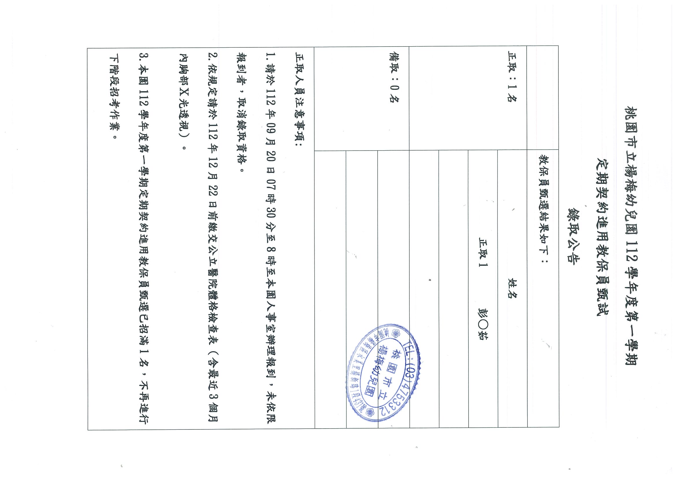 桃園市立楊梅幼兒園112學年度定期契約進用教保員錄取公告