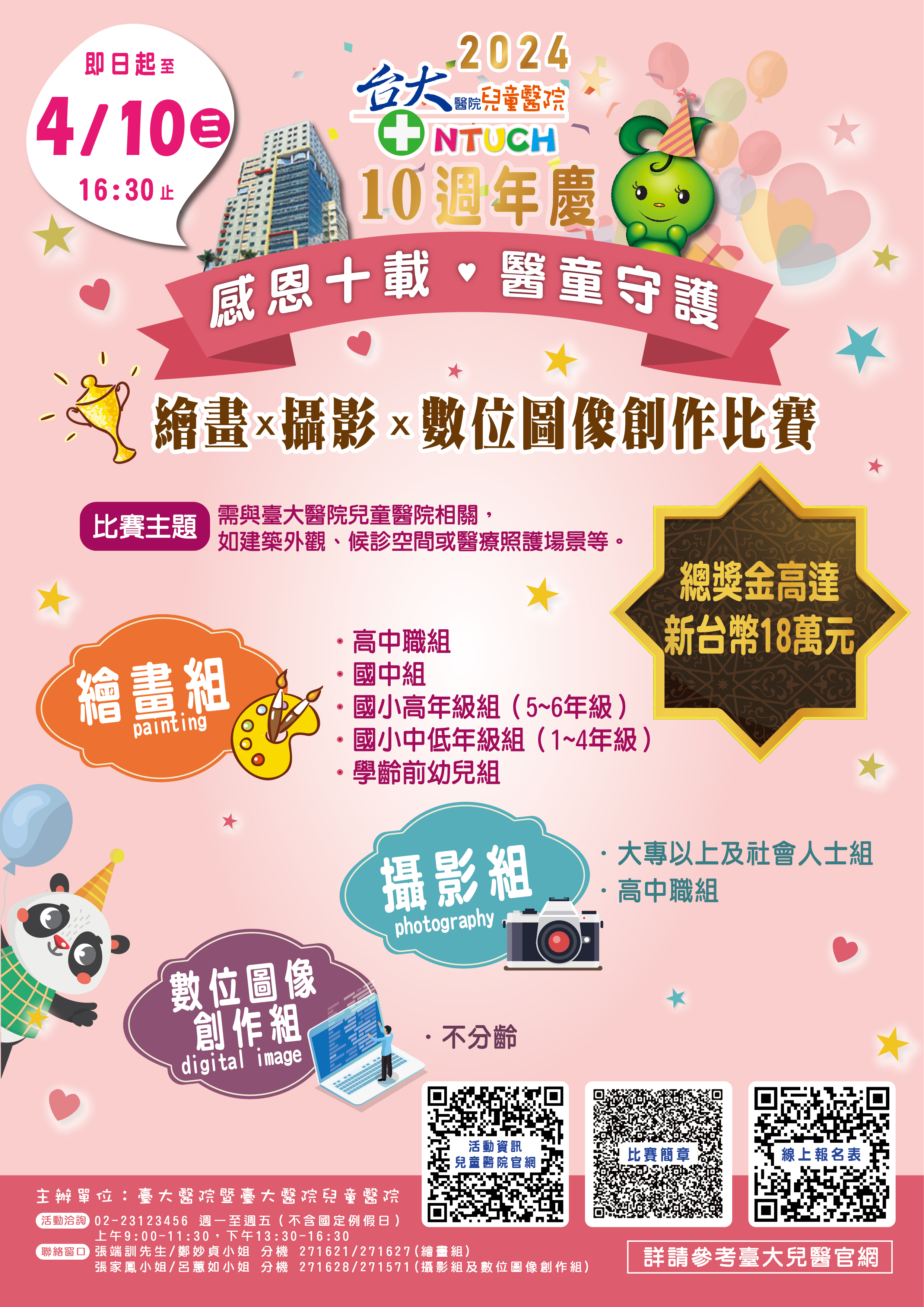 轉知:國立臺灣大學醫學院附設醫院暨兒童醫院辦理「2024臺大醫院兒童醫院10週年慶-感恩十載.醫童守護-繪畫、攝影與數位創作比賽」