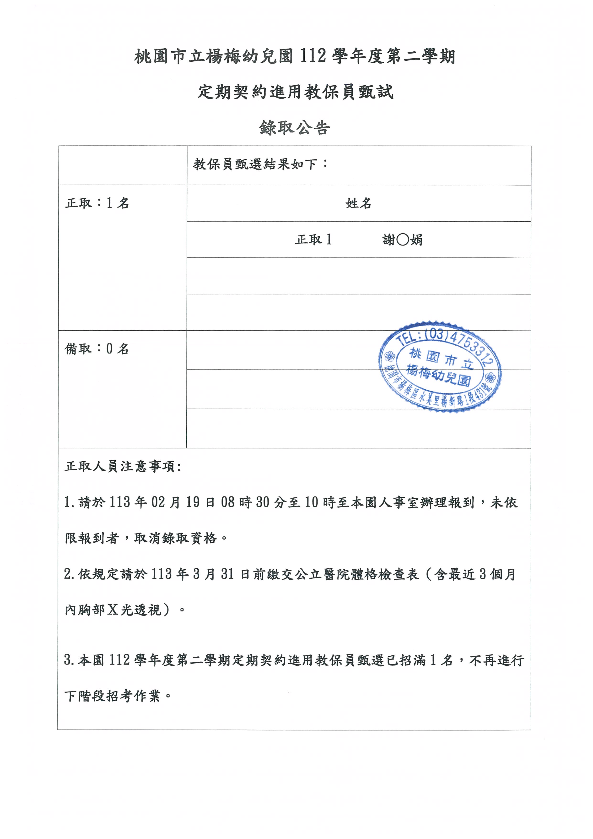 112學年第二學期定期契約進用教保員錄取公告(聘期113年3月12日至7月31日)